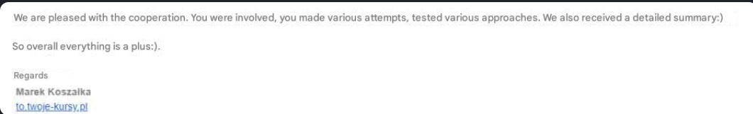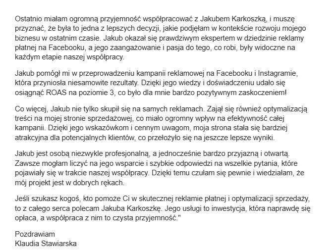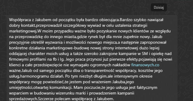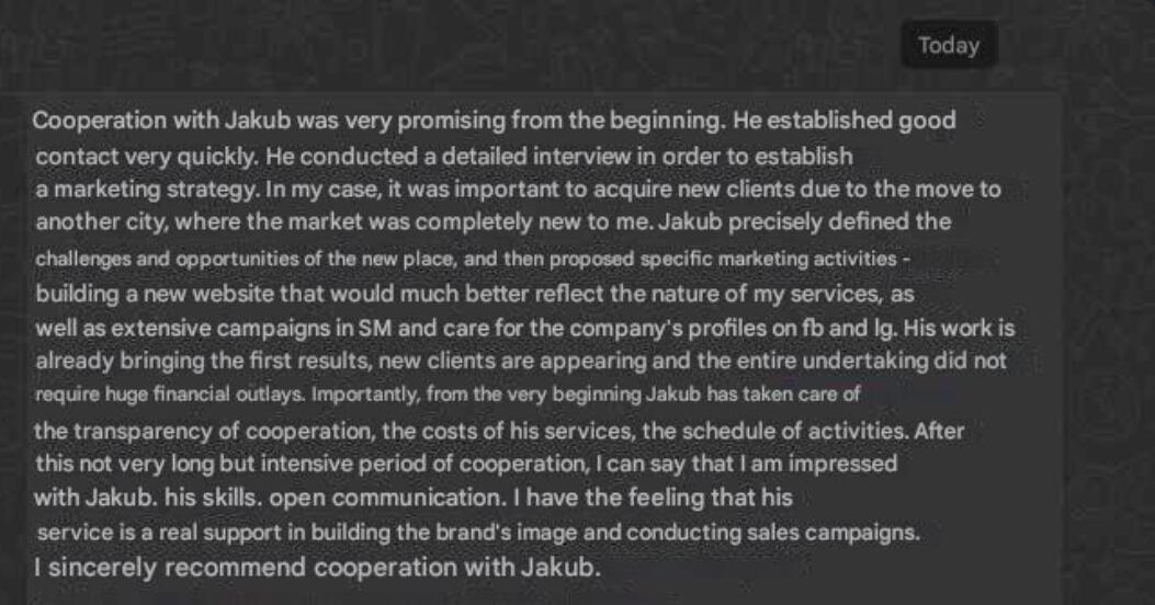 3) Albo jesteś po prostu spoko 😎Kilka słów o mnie (będzie krótko, obiecuję).Nazywam się Jakub, mam 18 lat i prawie połtora roku temu rozpocząłem moją przygodę z digital marketingiem / copywritingiem.Technicznie powinienem nazywać się agencją marketingową, ale totalnie się z tym nie identyfikuję.Dlaczego?Bo robię wszystko inaczej niż agencje. Wiem więcej niż agencje. FAKTYCZNIE DOWOŻĘ WYNIKI.Ale tym dzielę się więcej na moim IG.Zrealizowałem już ponad 20 projektów dla 10+ klientów.90% z nich zakończyło się maszynką do pieniędzy.10%? Dało mi lekcje, które dziś przynoszą efekty.Mój największy klient ma 175.000 obserwujących, najmniejszy - 800.Wszyscy zarabiają, a prawie każdy z nich mówi to samo:„To pierwsza współpraca marketingowa, w której ktoś naprawdę się postarał – od propozycji aż po wynik.”Jak na ten moment głównie dokonuję cudów marketingowych w niszy infoproduktów, więc jeśli jesteś z tej niszy i masz do zaoferowania coś, co zmienia życia ludzi - możemy pogadać.A jeśli nie jesteś… to też możemy pogadać - może coś z tego będzie ;)I tak, wiem...Ta strona nie wygrywa w kategorii „design roku”.Ale aktualnie skupiam się na tym, żeby moi klienci wygrywali w swoich rynkach :)Dobra, już nie gadam.(Aktualnie przyjmuję projekty tylko na listę oczekujących.)
